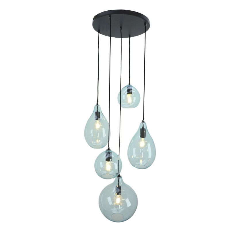 La suspension design en verre Cees est de couleur bleue. La suspension bleue est fournie sans sources lumineuses correspondantes. Cette lampe doit contenir 5 sources lumineuses avec raccords E27. La puissance maximale des sources lumineuses ne doit pas dépasser 40 watts par ampoule.